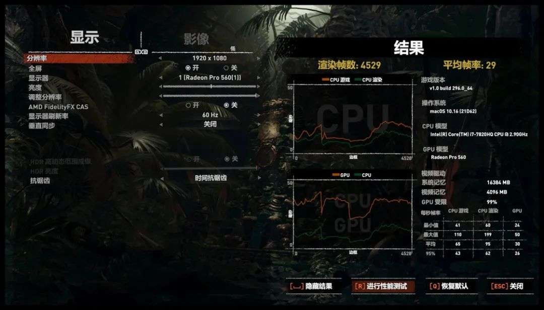 游戏部分就不多测了,购入这个本子的人也不是为了打游戏。所以只跑《古墓丽影:暗影》的基准测试供参考,1080P 预设低能勉强跑到 29 帧的成绩,可以说也就只能打打完全不吃性能网游和单机了。