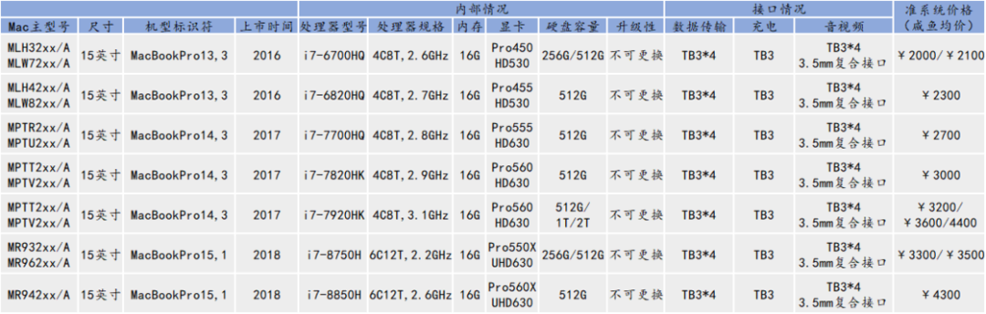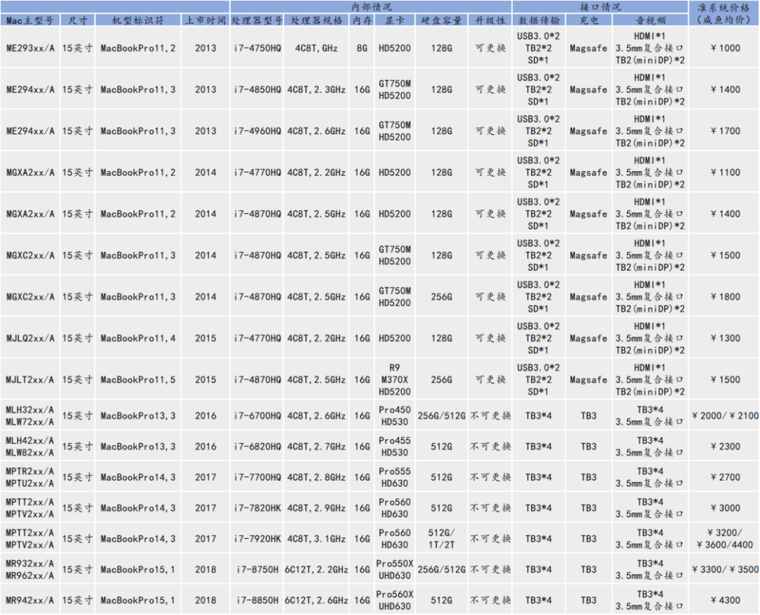 花了一天时间,把 2013 年到 2018 年可以入手玩玩的 MacBook Pro 筛了出来,当然很多款式已经没有下半身的机器在二手市场交易了。考虑到笔记本本身的性能问题,采用 i5 处理器的旧款 MacBook Pro 甚至连 Big Sur 都不能很好的支持,故也不做推荐。表格中详细列出了咸鱼在售的这些二手断头本的型号,标识符和具体配置,请大家一定要参考此表去核对售卖信息。