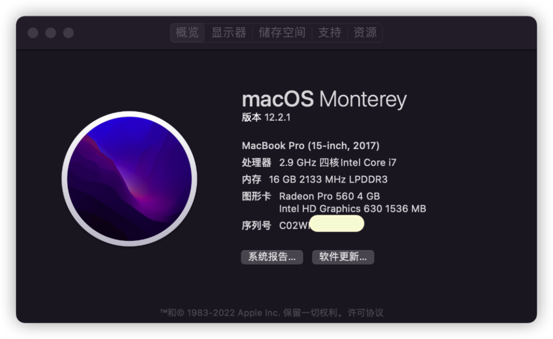 机子配置和序列号也完全可以对上,到手时的系统还是 macOS Sierra,现在已经更新到 Monterey 了。使用起来没有任何的卡顿,毕竟是旗舰机配置,估计再坚持两个大版本还是没问题的。