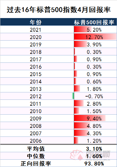 对于股民而言,好消息是历史上美股4月份的表现强得令人吃惊。据LPL Financial分析师Ryan Detrick的分析指出,自1950年以来,四月份一直是美股表现最好的月份。过去的16年当中,94%的时间里标普500指数在4月表现强劲,平均回报率为3.1%,2020年4月的回报率最高,为12.7%,2012年4月的回报率最低为-0.7%。