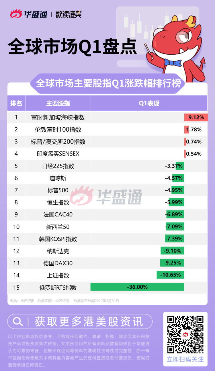 下图将帮助投资者回顾全球主要股指一季度的具体表现:今年一季度,富时新加坡海峡指数以9.12%的涨幅高居榜首,俄罗斯RTS指数以36%的跌幅成为最大输家。