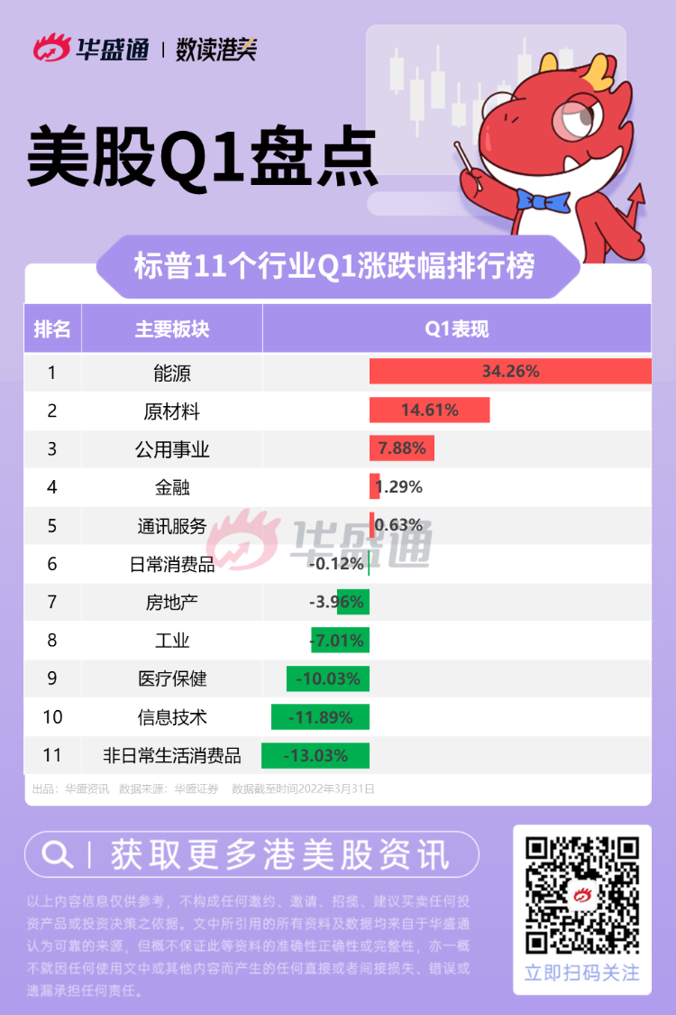 截至3月31日美股收盘,在标普11个行业中,能源行业以34.26%的涨幅遥遥领先,非日常生活消费品行业以13.03%的跌幅垫底。