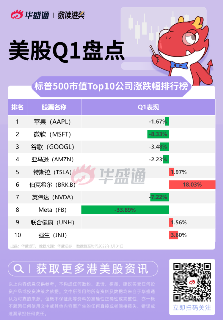 截至3月31日美股收盘,标普500市值Top10公司中,巴菲特的伯克希尔 $BRK.B 一枝独秀,一季度股价大涨18%;Meta $FB 则大跌超33%,排名垫底。