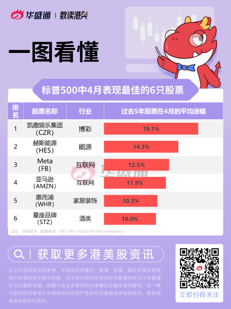 据IBD和标普全球市场情报数据,下图盘点了在过去五年中四月份每年都能跑赢标普500指数的6只股票,它们在四月的平均涨幅都超过了10%。