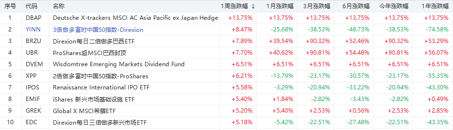 区域ETF方面,3倍做多富时中国50指数-Direxion $YINN 周累计上涨8.47%(DBAP、DVEM已退市)。其次,Direxion每日二倍做多巴西ETF $BRZU 周累计涨7.89%。