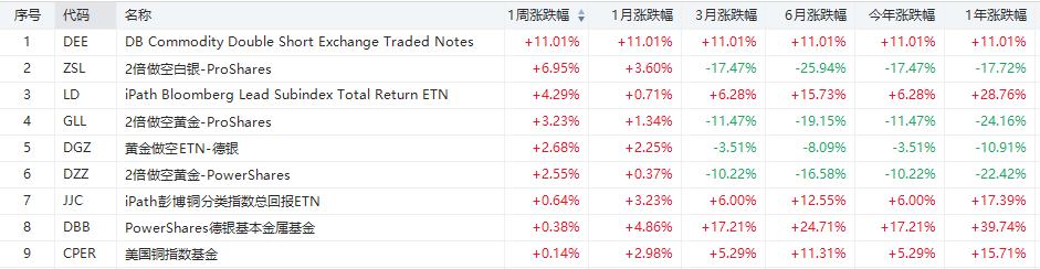 商品ETF中,涨幅居前的是2倍做空白银-ProShares $ZSL ,一周累计上涨6.95%。2倍做空黄金-ProShares $GLL 周累计上涨3.23%。(DEE已退市)