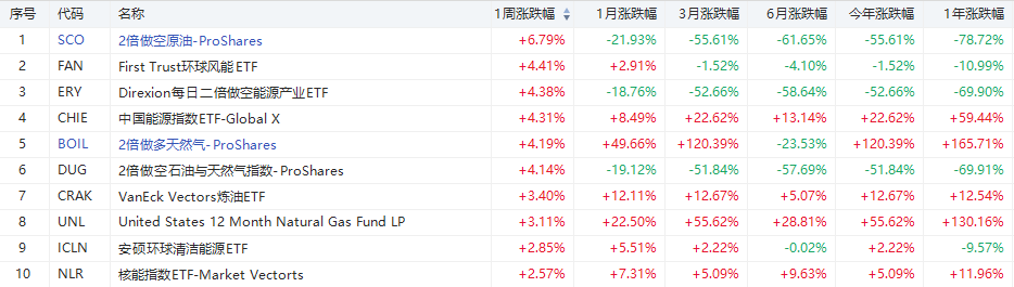 本周能源ETF涨幅榜方面,本周涨幅居前的2倍做空原油-ProShares $SCO ,周累计上涨6.79%。