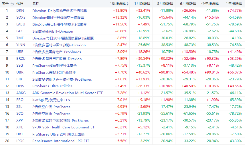 1、本周美股ETF涨幅榜