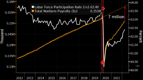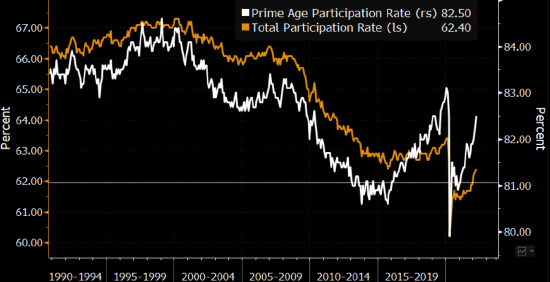 如果以疫情前的劳动参与率来衡量,失业率可能会降至5.1%(前值为5.5%)。