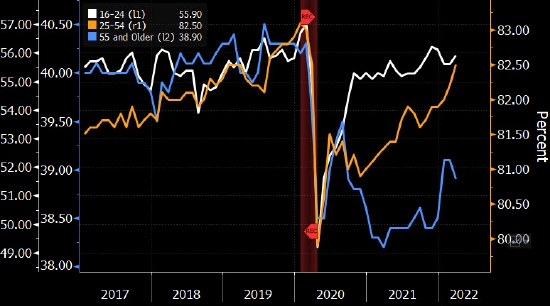 参与率的上升——主要集中在壮年工人——表明长期受到疫情抑制的劳动力供应出现复苏。倘若对儿童保育和健康的担忧消退,那么今年的壮年工人的劳动参与率可能会触及疫情前的高点。超量和预期退休将更难扭转。