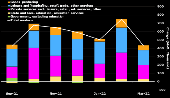 我们预计未来几个月的招聘速度将同样强劲。我们对4月非农就业人数的初步估计为增加45万至50万人。