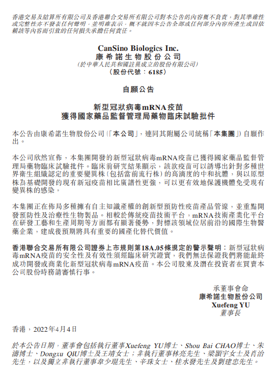 4月4日消息,康希诺生物在港交所公告,本集团开发的新型冠状病毒mRNA疫苗已获得国家药品监督管理局药物临床试验批件。临床前研究结果显示,该款疫苗可以诱导出针对多种世界卫生组织认定的重要变异株(包括当前流行株)的高滴度的中和抗体,与以原型株为基础开发的现有新冠疫苗相比广谱性更强,可以更有效地保护机体免受现有变异株的感染。