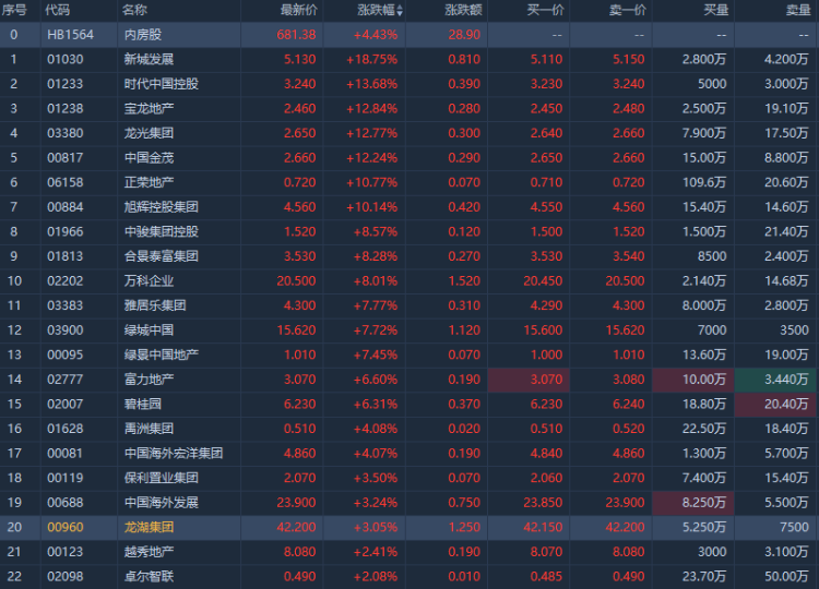 华盛资讯4月4日讯,内房股早盘持续飙涨,截至发稿,新城发展涨逾18%,时代中国涨逾13%,中国金茂涨超12%,万科企业涨超8%,碧桂园涨超6%。