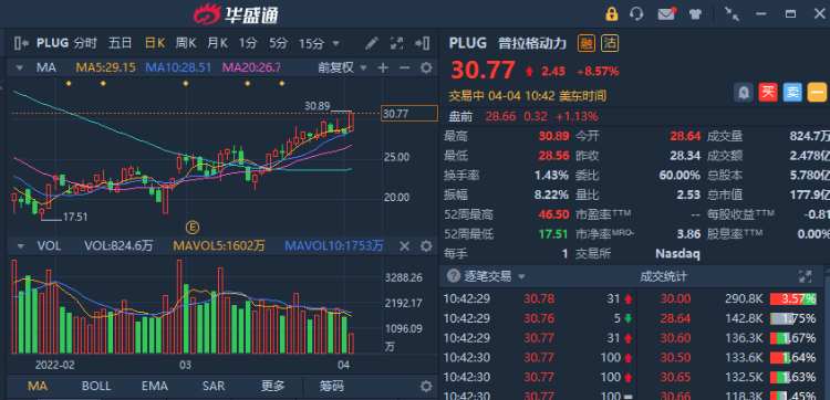 华盛4月4日讯,美股氢能源板块普涨,普拉格动力(PLUG)涨超8%,燃料电池能源(FCEL)涨超7%,Bloom Energy(BE)涨超4%。