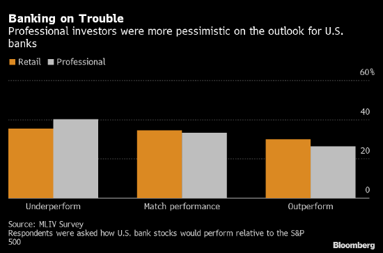 79%的受访者预计收益率曲线将保持趋平态势。在这种环境下,美国银行股的表现被认为比整体市场更糟。不过专业和散户投资者对此事存在明显的看法分歧,专业人士对银行股的前景更加悲观。