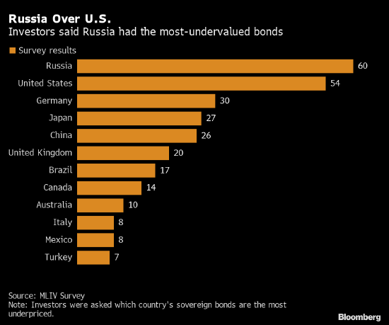 对于在哪些市场看到了投资价值,受访者的回答出人意料。在被问及哪个国家的主权债券最被低估时,60人提到了俄罗斯。受访者还青睐美国,德国,日本和中国的债券。巴西,墨西哥和土耳其也获得了大量支持。