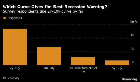 略超一半的受访者认为,2-10年期收益率曲线的倒挂最有可能是经济衰退信号。只有12%的受访者认同美联储主席鲍威尔的观点,相信18个月后3个月期收益率水平与目前3个月期收益率之差才是经济衰退风险相关指标。