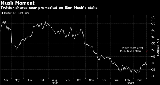 周一提交的监管文件披露了马斯克的交易后,推特股价一度飙升26%,创下四年多来最大盘中涨幅。以上周五的收盘价计算,这部分股权价值约28.9亿美元。
