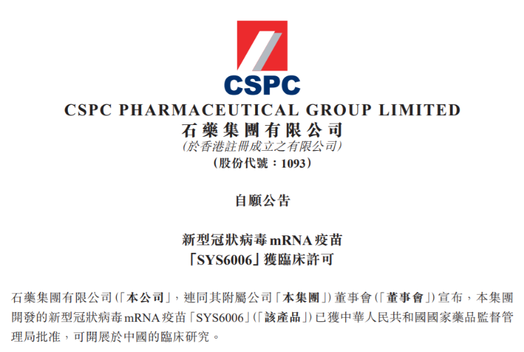 4月3日,石药集团宣布,基于在安全性、有效性以及产业化方面的优势,并根据疫情防控的需要,其开发的新型冠状病毒mRNA疫苗SYS6006SYS6006被国家药监理局列入特别审批程序,快速批准进入临床。