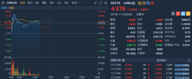 截至发稿,中国中药涨4.82%,报4.57港元/股。