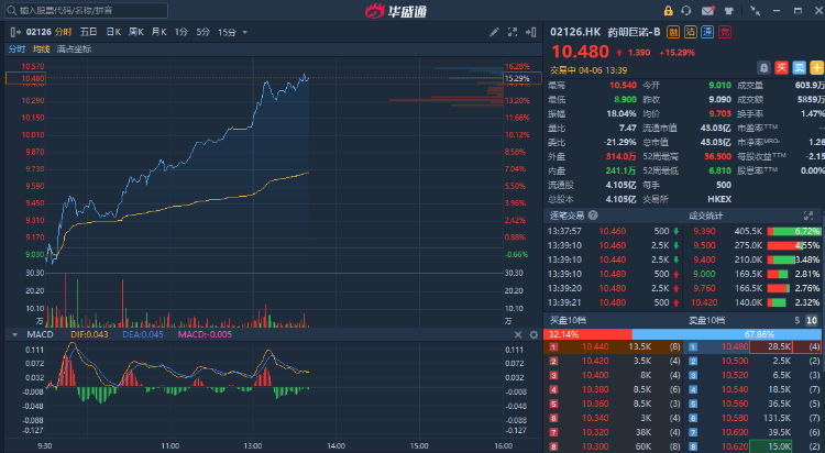 截至发稿,药明巨诺涨15.29%,报10.48港元/股,当前总市值为43.03亿港元。