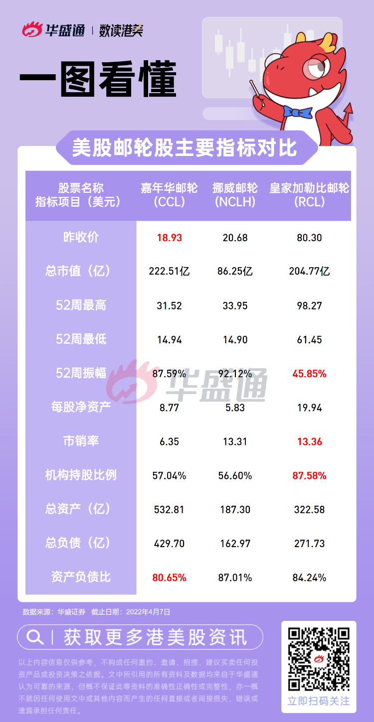局长拉取了三只主要邮轮股的指标进行了对比,以供各位读者参考。其中皇家加勒比邮轮 $RCL 在52周振幅、市销率以及机构持股比例方面具备优势,而嘉年华邮轮 $CCL 在昨收价、资产负债比方面的表现更加友好。