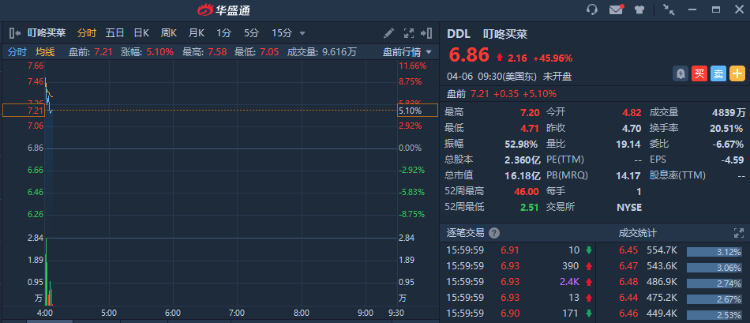 华盛资讯4月6日消息,美股盘前,中概生鲜电商股继续走高。叮咚买菜 $DDL 涨超5%,隔夜收涨超45%;每日优鲜 $MF 涨近11%,隔夜收涨超14%。