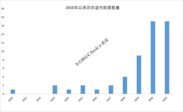 据海通证券研报数据显示,2019年-2021年退市数量分别为10、16、20家,同比增速分别为100%、60%、25%,仅这三年的退市公司数量就占到A股全部退市数量的31%。
