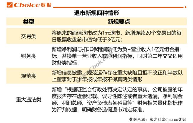 二是财务指标未达标将退市:包括上市公司的连续两年净利润为负数同时总营收低于1亿元,将会被终止上市处理,或者上市公司的总市值日均低于3亿元也将被采取强制退市处理;