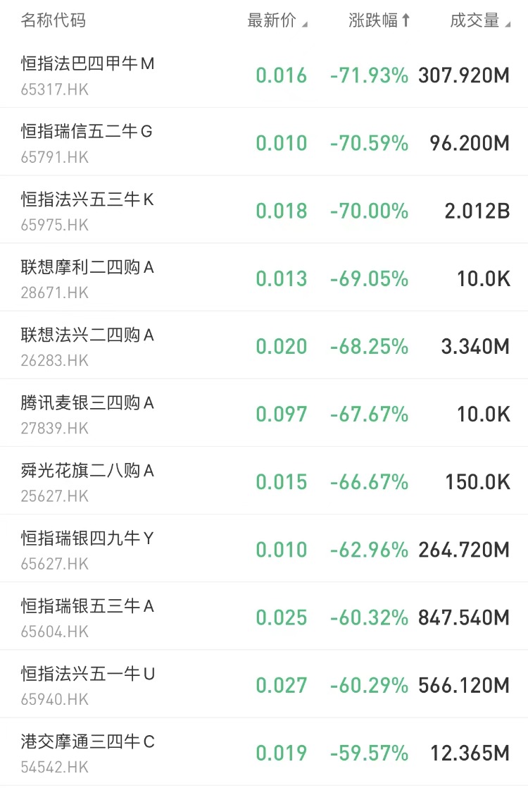 在今日跌幅榜中,恒指法巴四甲牛M $65317.HK 跌71.93%,联想法兴二四购A $26283.HK 跌68.25%。