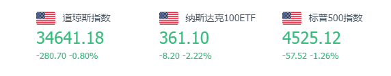 截至周二收盘, 道指收盘下跌280.70点,跌幅为0.80%,报34641.18点;纳指跌328.39点,跌幅为2.26%,报14204.17点;标普500指数跌57.52点,跌幅为1.26%,报4525.12点。