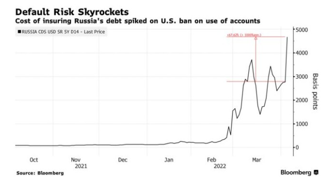 4、俄罗斯或将被迫违约?俄罗斯五年期违约风险涨至87.7%
