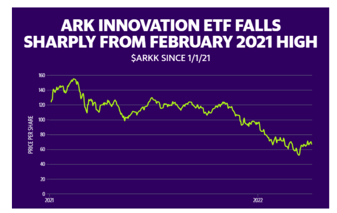 今年第一季度,美股股票型基金普遍表现不佳,其中尤其是小市值成长型股票基金损失惨重。在这之中,一向以押注创新型成长股闻名的方舟创新基金(ARKK)损失巨大。