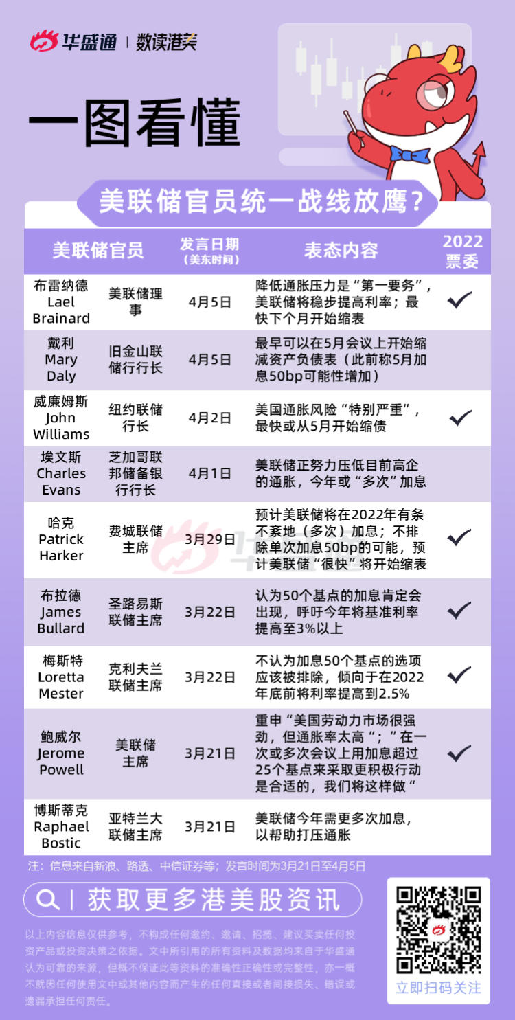 美联储加息25个基点的“靴子”才刚在上个月落地,而3月以来,已有不少美联储官员密集发出“鹰声”,令市场对年内多次加息50个基点的预期持续升温: