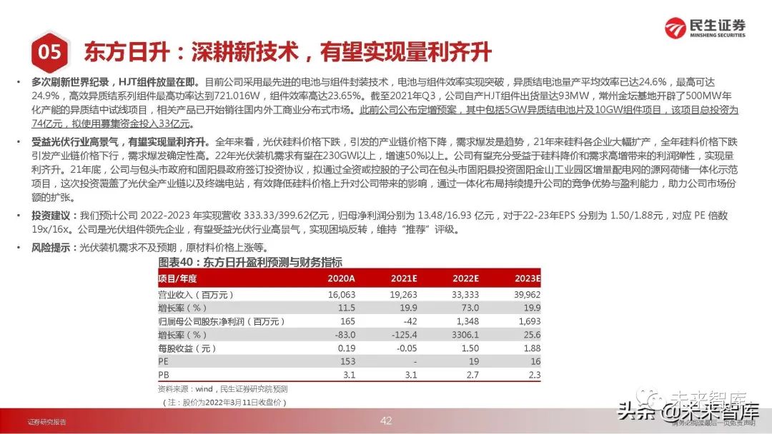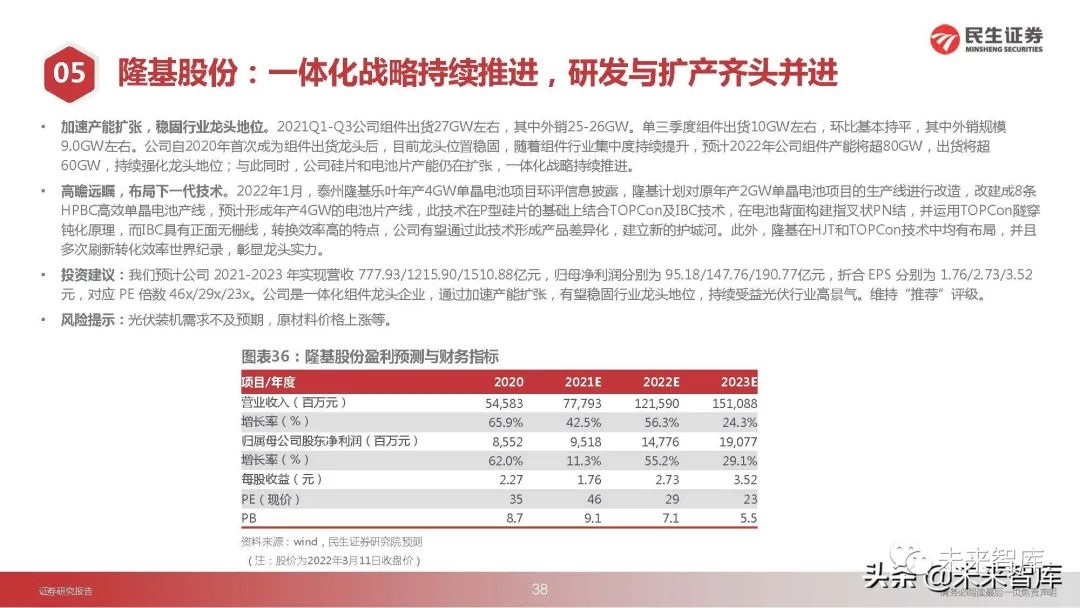 加速产能扩张,稳固行业龙头地位。2021Q1-Q3公司组件出货27GW左右,其中外销25-26GW。单三季度组件出货10GW左右,环比基本持平,其中外销规模 9.0GW左右。公司自2020年首次成为组件出货龙头后,目前龙头位置稳固,随着组件行业集中度持续提升,预计2022年公司组件产能将超80GW,出货将超 60GW,持续强化龙头地位;与此同时,公司硅片和电池片产能仍在扩张,一体化战略持续推进。(报告来源:未来智库)