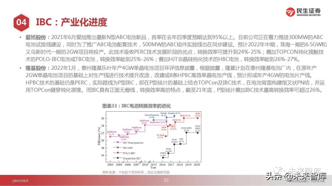 技术迭代一直以来是推动光伏行业发展的关键。过去数年是PERC电池应用快速扩张阶段,进入2022年,光伏电池片的技术迭代正式 迎来了新的时代,TOPCon、HJT、IBC等转换效率更高的电池技术将从实验室迈向产业链,在形成投产-规模化效应降本-持续扩产的 良性循环过程中,享受技术红利的企业有望迎来市占率提升+享受技术溢价的双重优势。