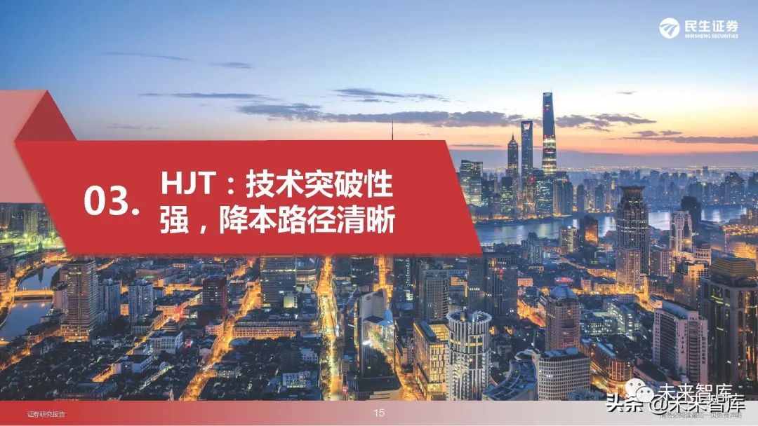 优势二:转换效率高。主要得益于N型硅衬底以及非晶硅对基底表面缺陷的双重钝化作用。目前量产效率普遍已在24%以上;25%以上 的技术路线已经非常明确,即在前后表面使用掺杂纳米晶硅、掺杂微晶硅、掺杂微晶氧化硅、掺杂微晶碳化硅取代现有的掺杂;HJT未 来叠加IBC和钙钛矿转换效率或可提升至30%以上。