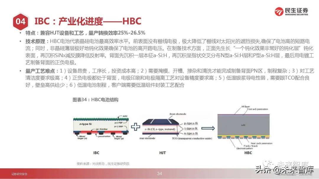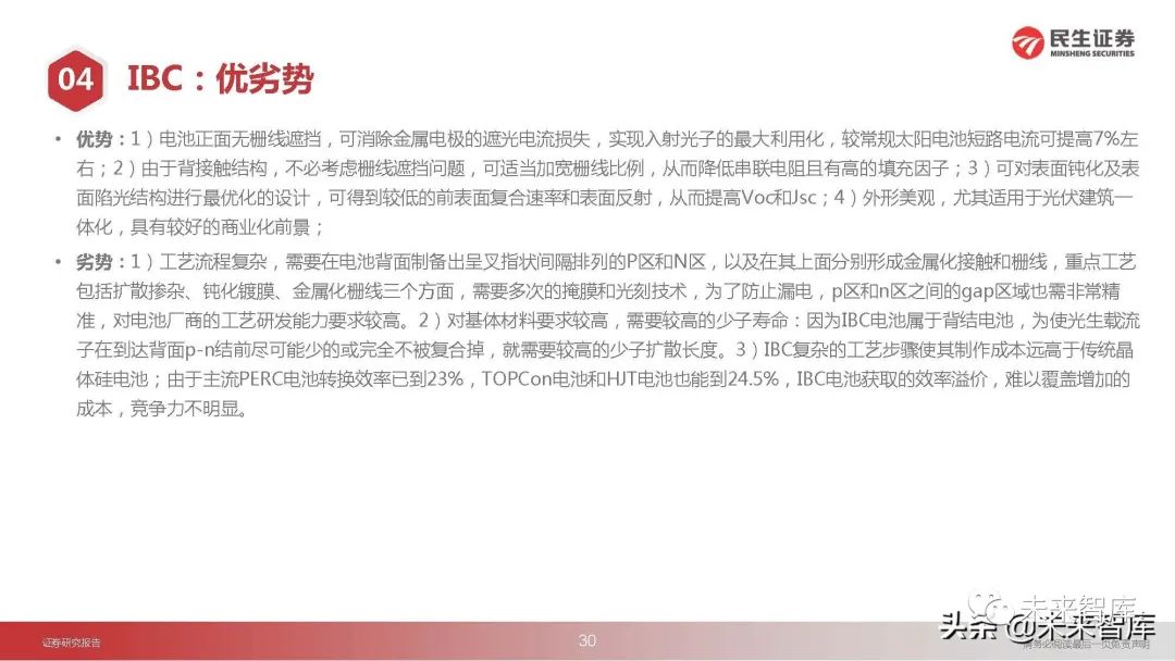 劣势:1)工艺流程复杂,需要在电池背面制备出呈叉指状间隔排列的P区和N区,以及在其上面分别形成金属化接触和栅线,重点工艺 包括扩散掺杂、钝化镀膜、金属化栅线三个方面,需要多次的掩膜和光刻技术,为了防止漏电,p区和n区之间的gap区域也需非常精 准,对电池厂商的工艺研发能力要求较高。2)对基体材料要求较高,需要较高的少子寿命:因为IBC电池属于背结电池,为使光生载流 子在到达背面p-n结前尽可能少的或完全不被复合掉,就需要较高的少子扩散长度。3)IBC复杂的工艺步骤使其制作成本远高于传统晶 体硅电池;由于主流PERC电池转换效率已到23%,TOPCon电池和HJT电池也能到24.5%,IBC电池获取的效率溢价,难以覆盖增加的 成本,竞争力不明显。
