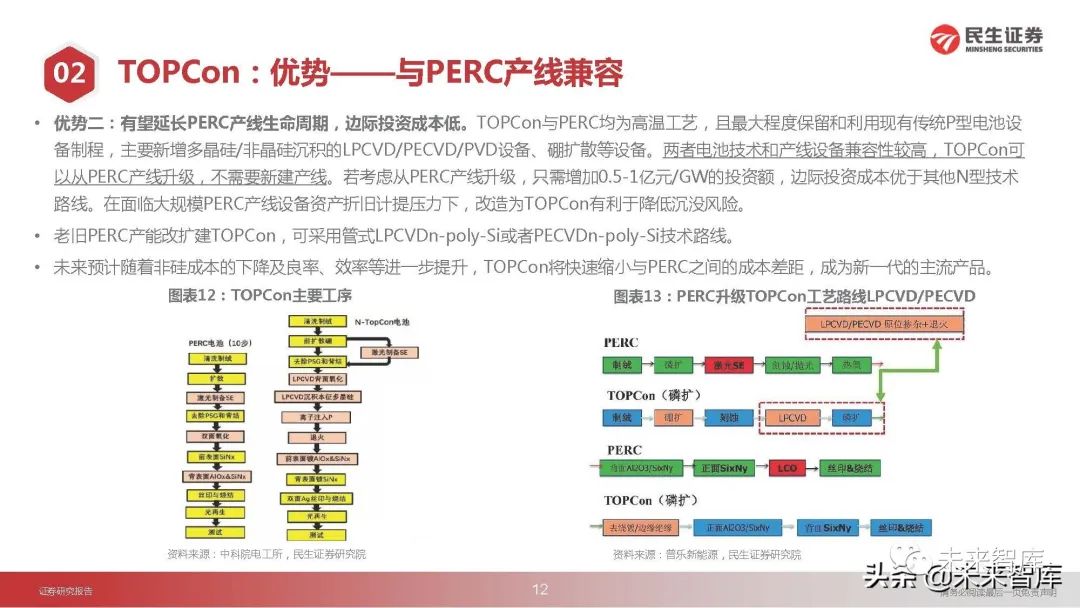 优势二:有望延长PERC产线生命周期,边际投资成本低。TOPCon与PERC均为高温工艺,且最大程度保留和利用现有传统P型电池设 备制程,主要新增多晶硅/非晶硅沉积的LPCVD/PECVD/PVD设备、硼扩散等设备。两者电池技术和产线设备兼容性较高,TOPCon可 以从PERC产线升级,不需要新建产线。若考虑从PERC产线升级,只需增加0.5-1亿元/GW的投资额,边际投资成本优于其他N型技术 路线。在面临大规模PERC产线设备资产折旧计提压力下,改造为TOPCon有利于降低沉没风险。老旧PERC产能改扩建TOPCon,可采用管式LPCVDn-poly-Si或者PECVDn-poly-Si技术路线。未来预计随着非硅成本的下降及良率、效率等进一步提升,TOPCon将快速缩小与PERC之间的成本差距,成为新一代的主流产品。