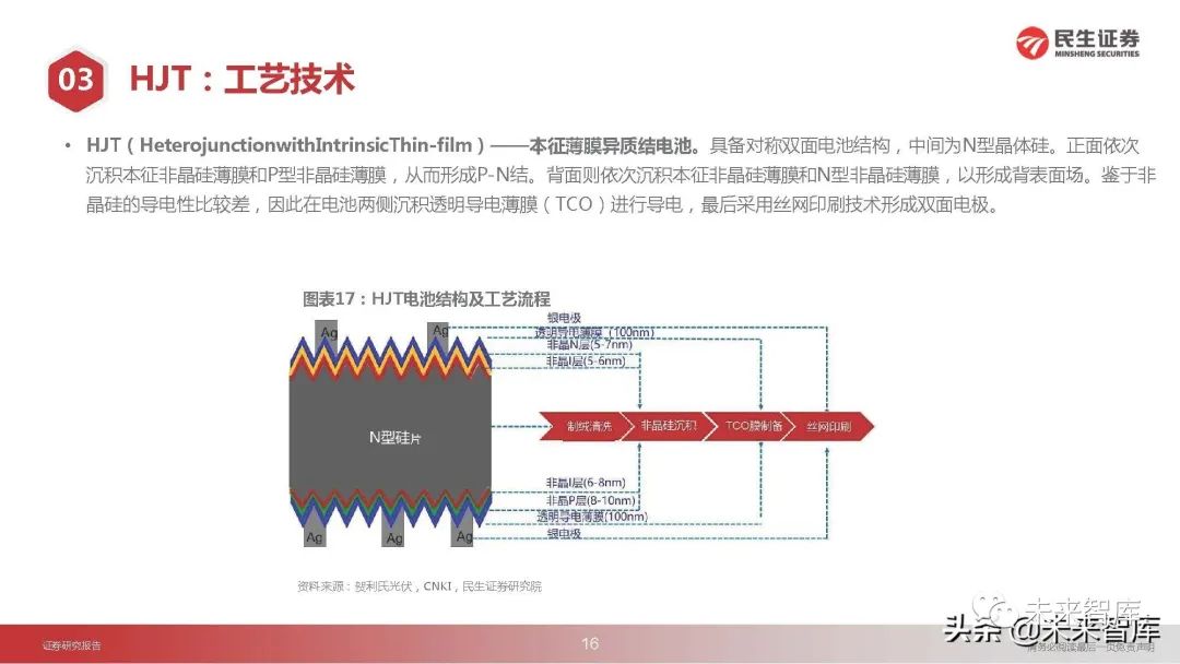 HJT(HeterojunctionwithIntrinsicThin-film)——本征薄膜异质结电池。具备对称双面电池结构,中间为N型晶体硅。正面依次 沉积本征非晶硅薄膜和P型非晶硅薄膜,从而形成P-N结。背面则依次沉积本征非晶硅薄膜和N型非晶硅薄膜,以形成背表面场。鉴于非 晶硅的导电性比较差,因此在电池两侧沉积透明导电薄膜(TCO)进行导电,最后采用丝网印刷技术形成双面电极。