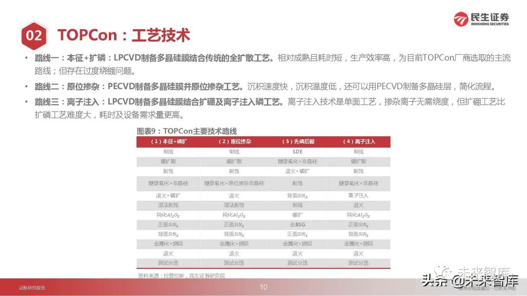 良率较低的原因:1)加工工艺步骤较多、且目前技术路线并不统一,多条技术路线并行。2)高温工艺导致翘曲、碎片等问题较为突 出,LP隧穿氧化的均匀性导致暗片、脏污的情况出现也降低了良率表现。3)隧穿氧化工艺过程中出现卡槽印等。以上问题有望随着产 业化加速逐步改善。(报告来源:未来智库)