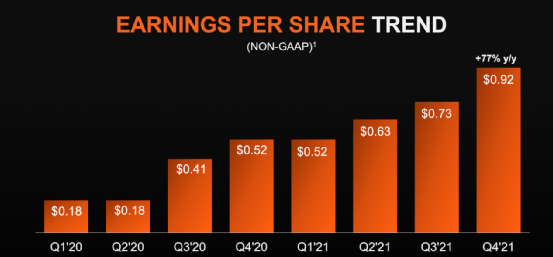 毛利率的扩大有助于抵消有关供应链限制的持续问题。AMD 还实现了一些运营杠杆,帮助其每股收益增长了 77%。