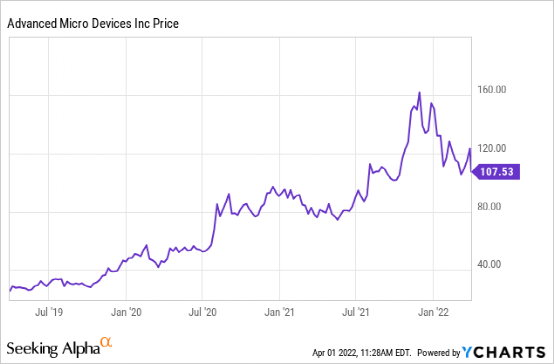 AMD 以每股 50 美元左右的价格进入大流行。该股随后达到每股 160 美元以上的峰值,然后在最近的交易中收于每股 107 美元左右。