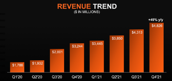 虽然收入增长得益于公司在个人计算和显卡领域的典型“生计”业务增长 32%,但推动近期大部分业务增长的是其云计算和企业业务线 75% 的增长。事态发展。最近一个季度来自云计算和企业的收入总计 22 亿美元,占总收入的 46%(高于 2020 年第四季度的 39% 和 2019 年第四季度的 22%)。