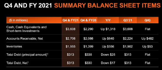 我注意到营业利润率已从 2019 年的 12.5% 扩大到 2021 年的 25%。就在 2017 年,有人谈论 AMD 由于其高债务负担和缺乏收益而承担财务偿付能力风险。这一切都发生了变化,因为该公司现在是一台现金流机器,本季度产生了 7.36 亿美元的自由现金流。