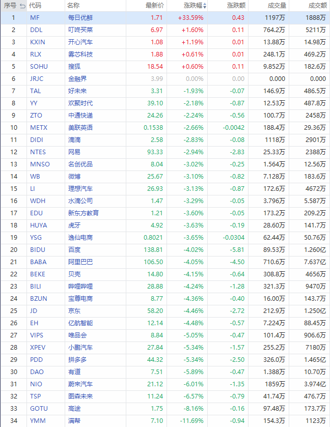 部分中概股逆市上涨,每日优鲜(MF)大涨超33%,叮咚买菜(DDL)、开心汽车(KXIN)涨超1%,雾芯科技(RLX)微涨。
