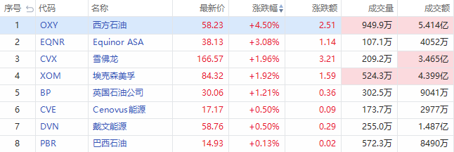 华盛资讯4月6日消息,美股盘中,油气板块股票普遍走高,截至发稿,西方石油(OXY)涨超4%,Equinor ASA(EQNR)涨超3%,雪佛龙(CVX)、埃克森美孚(XOM)、英国石油公司(BP)涨超1%,Cenovus能源(CVE)、戴文能源(DVN)、巴西石油(PBR)微涨。
