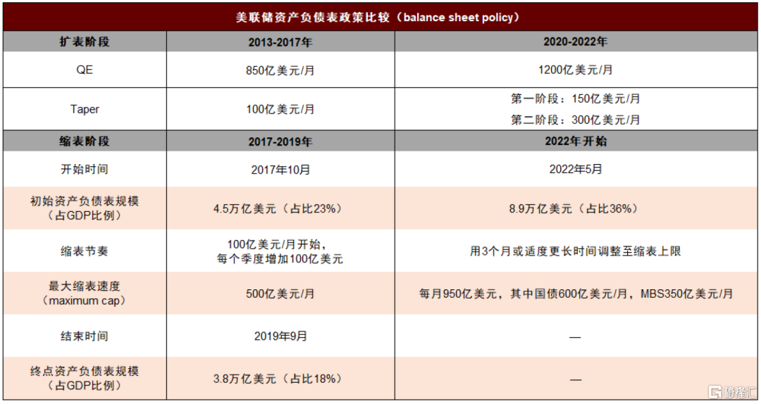 1)缩表时间更早,5月有望官宣。纪要显示,与会者一致认为,在缩表计划的讨论上已经取得了实质性进展(substantial progress),美联储完全有能力在5月会议结束后就开始削减资产负债表(…the Committee was well placed to begin the process of reducing the size of the balance sheet as early as after the conclusion of its upcoming meeting in May)。这一表述与美联储理事、下一届副主席人选布雷纳德稍早前的表态一致,她也认为最早将于5月开始缩表[2]。对比上一轮紧缩周期(2017-2019年),这次缩表开启时间更早。上次从开始加息到缩表间隔了2年。这次或只间隔2个月,时间较上次大大缩短。