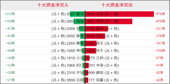 淡仓(认沽证及熊证)方面,周三个股相关淡仓资金净流入方面规模均较小;相反,京东相关淡仓单日录得976万港元资金净流出,美团、腾讯、阿里等淡仓单日亦录得少量港元资金净流出。