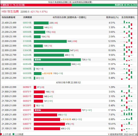 街货分布方面,至周三,恒指牛证街货重货区间主要仍在收回价21100点至21600点之间,累计相当约2,375张期指合约;恒指熊证街货重货区主要仍在收回价22500点至23100点,累计相当约2,955张期指合约。